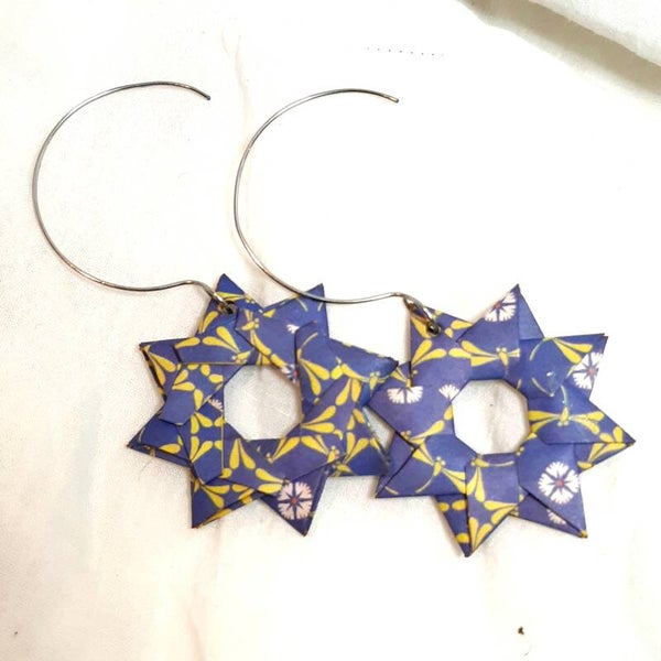 Bijoux, boucles d'Oreilles, Création, Origami, Soleil, étoile, sun, star, créole, origami modulaire, Fait-Main, Papier Verni, Traditionnel, Japon, Fantaisie, Léger, Artisanat, idée cadeau, bijoux origami, hand made, upcycling